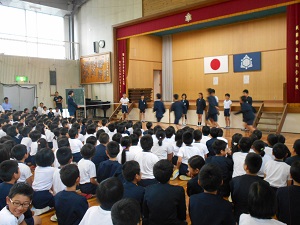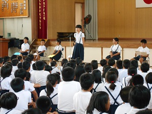 10月17日(火)の児童集会では、吹奏楽部による演奏「喜びの音楽を奏でて!」を聴きました。演奏後の感想交流では、「音がそろっていて上手でした」「すごかったです」といった言葉が聞かれました。吹奏楽部は10月22日(日)に熊本県立劇場で行われる器楽合奏コンクールに出場します。大きな発表の舞台に緊張もすると思いますが、積み重ねた自分の努力を信じて持てる力を十分発揮してきてください。