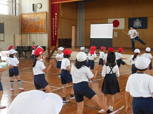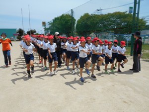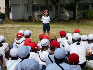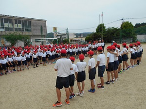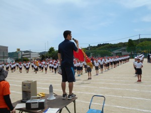 運動会本番まであと2週間となり,運動会に向けての全体練習が始まりました。写真は入場行進・開会式の練習の様子です。天気が良い中での練習でしたが,子どもたちは話を聞き,練習に励みました。暑い中での練習がしばらく続きます。体調の管理にも気を付けていきましょう。