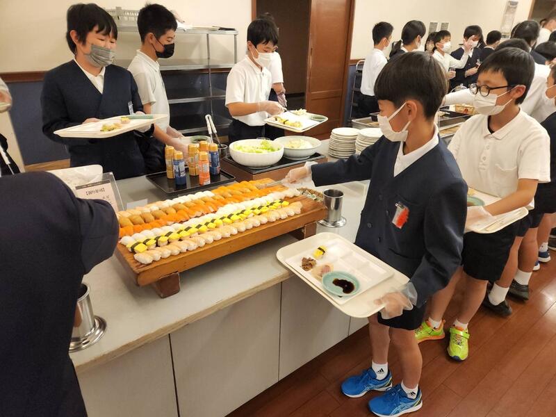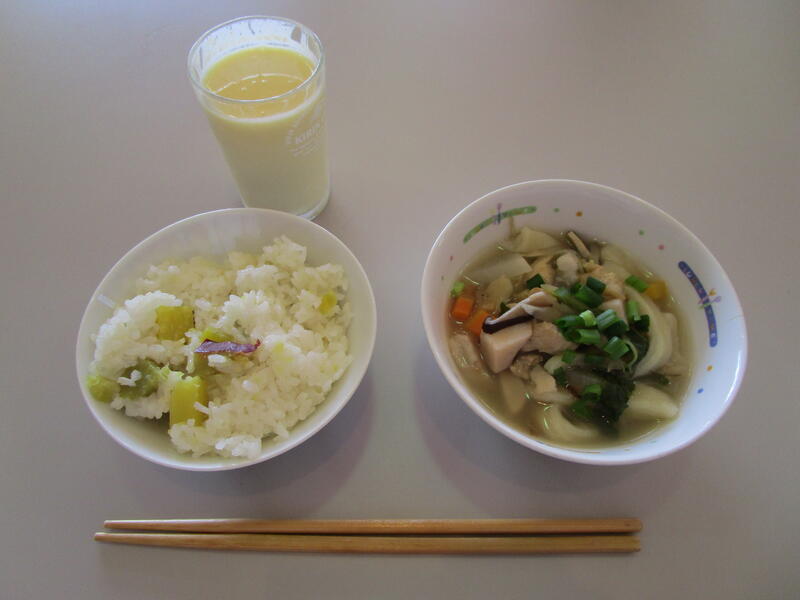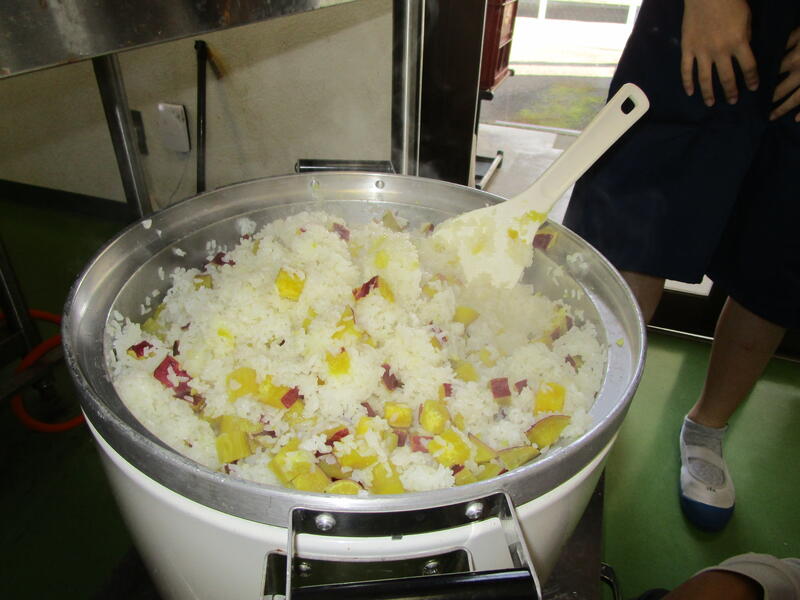 献立は、学校で育てたさつまいもを使った「いもご飯」と、天草の郷土料理「押し包丁」、「オレンジヨーグルト」でした。