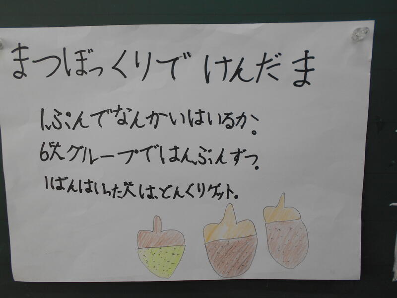 幼稚園の年長児と交流しました。一緒に松ぼっくりけん玉に絵付けをしたり、つくったおもちゃで遊んだりしました。1年生は、秋の実や落ち葉を使って、飾りや的入れゲームを作っておもてなしをしました。