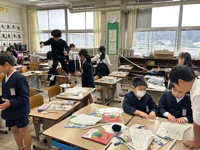 3年生は今日、1組さんも2組さんも、図工で教室を飾っていました。紙を切ったりつなげたり、学級全員で教室を飾っていました。みんな、「見てください!」とてもうれしそうでした。みんなでやるのが楽しいですね!