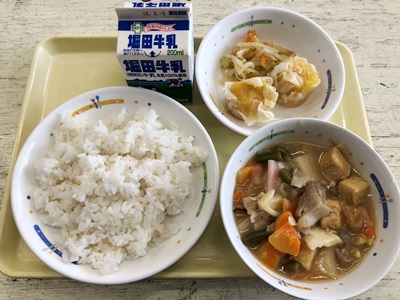 ごはん 牛乳 厚揚げの中華煮 もやしの和え物 にんじんシューマイ