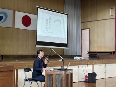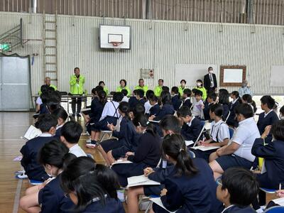 今日は振興会長、事務局等、地域の方々が多数おいでくださり本校の四年生に安全タスキを贈呈されました。四年生がこのタスキを朝夕使い安全に登下校しますとご挨拶しました。ありがとうございました。