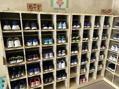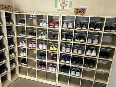 五年生の写真下は、亀小ブランド 「かかとそろえ」 いつも手本の六年生靴箱。高学年がしっかり引っ張っています。