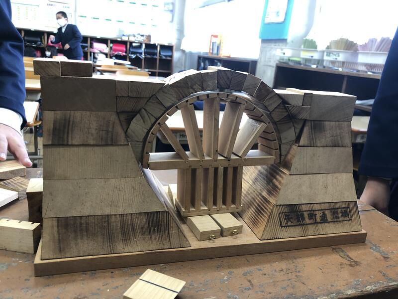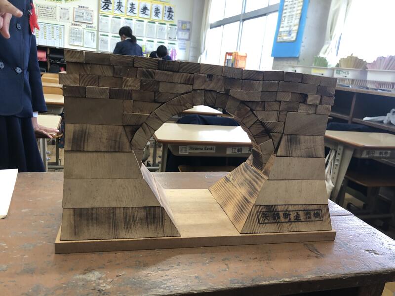 社会の授業で通潤橋について勉強しました。通潤橋が石でできたアーチ状の橋であることを学び、自分たちでも通潤橋の模型を使って実際に作っています。なかなかうまく作れず、通潤橋のすごさを体験しているようでした。