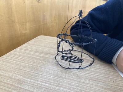 図工では、はり金を使って作品を作りました。最後には友達の作品を鑑賞して、いいところを見つけました。
