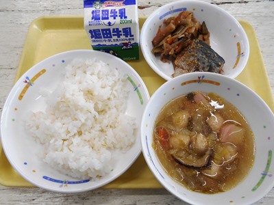 ぷちまるご飯 牛乳 肉だんごとしょうがのスープ 豚肉と根菜のきんぴら さばごま味噌煮