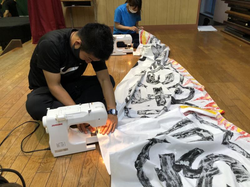 6年部の手により、6年生の子供たちが一週間かけて制作した運動会スローガン横断幕が完成しました。