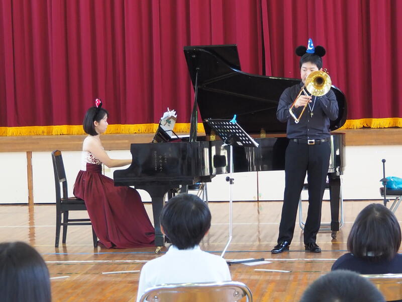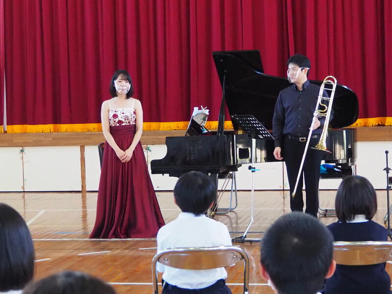 本日(9/29)芸術ふれあいコンサートがありました。ピアニストの山本亜矢子さんとトロンボーン奏者の辻田雅文さんが来てくださいました。新型コロナウイルス感染症拡大予防のために4年生のみの参加でしたが、ドラえもんの歌やドラゴンクエストの主題歌など子供たちも親しみやすいものもあり終始楽しそうに聴いていました。「誰も寝てはならぬ」というオペラの楽曲が心に残っているという声も聞きました。また、できればもう一度聴きたいなという声がたくさんありました。また機会があれば来ていただきたいものです。山本さん辻田さんありがとうございました。