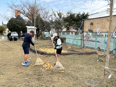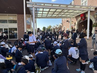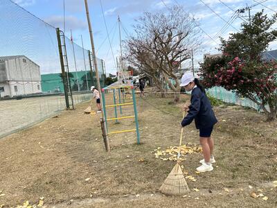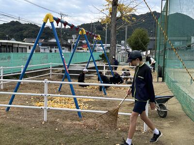 亀川小学校に設置いただいている地区のイルミネーション、とても美しいです。イルミネーションがある場所にしばらくは立ち入りが難しいため、6年生が落ち葉掃きをしてくれました。イチョウの黄色い絨毯は美しいですが滑りやすいので助かりました。ありがとうございます。
