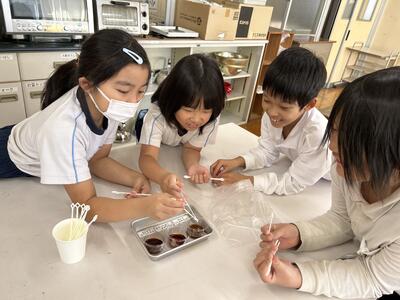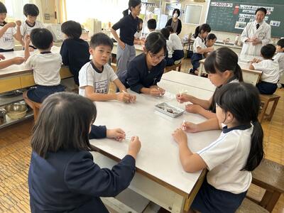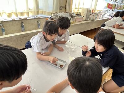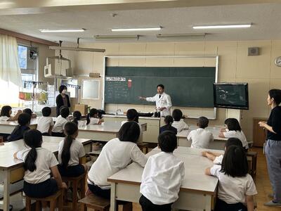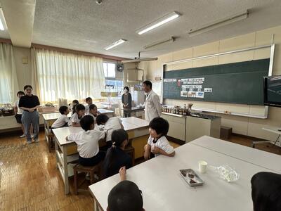 今日は熊本市内のフンドーダイ熊本から醤油博士がいらっしゃいました。三年生が大豆が醤油になるまでについて学びました。大豆→もろみ→醤油と変化し、味もそれぞれとてもおいしかったです。