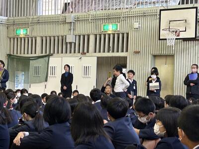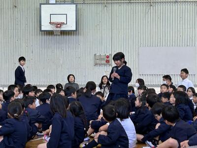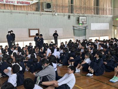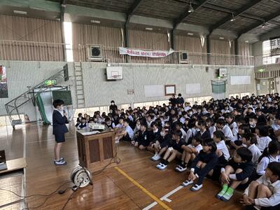 今日は生活委員会による児童集会がありました。今日のテーマは校庭に見かけるお菓子のごみと登下校について、この2つでした。