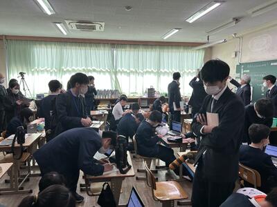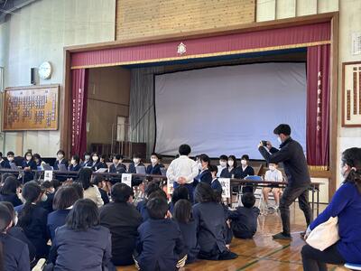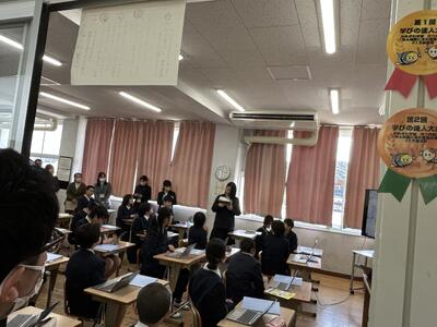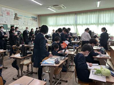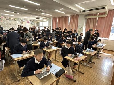 2月19日木曜日、今日は本校にたくさんの先生方がいらっしゃいました。今年1年のリーディングDXスクール事業指定校としての校内研修の集大成、公開授業を行いました。1年生と6年生の学びを見ていただきました。
