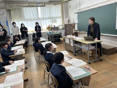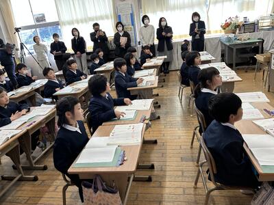 2月19日は亀川小学校の公開授業の日です。天草市教育委員会の指定を受け先生方が一丸となって授業研究に取り組んで来られました。授業公開は3学級ですが、その模擬授業として公開予定の1年2組担任田中先生が1組で授業されました。