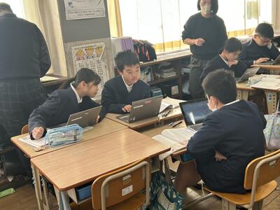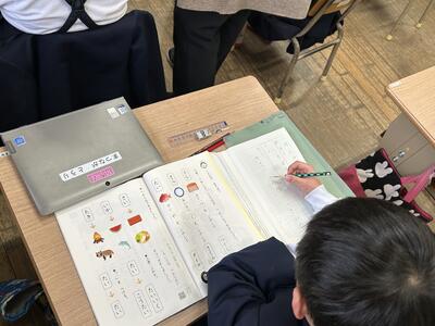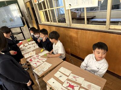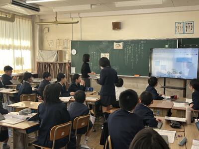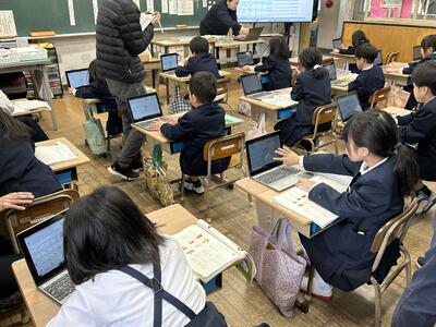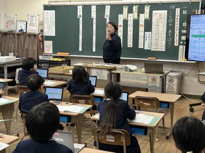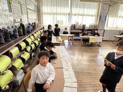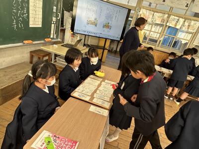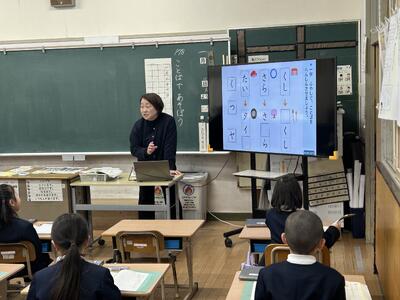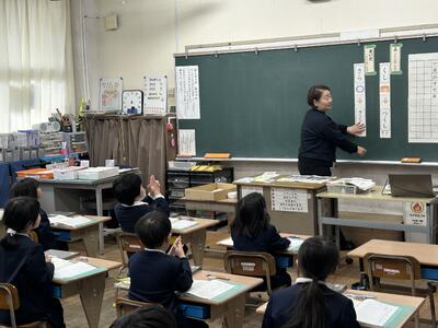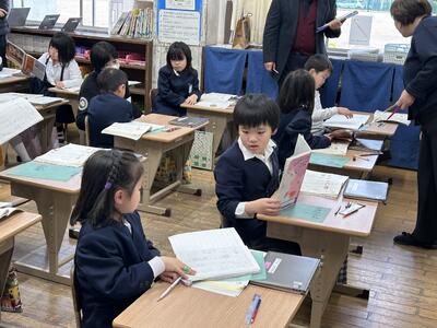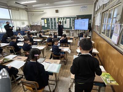 2月19日は亀川小学校の公開授業の日です。天草市教育委員会の指定を受け先生方が一丸となって授業研究に取り組んで来られました。授業公開は3学級ですが、その模擬授業として公開予定の1年2組担任田中先生が1組で授業されました。