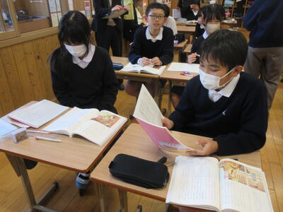 6年生の国語科研究授業を行いました。教材は「ぼくのブックウーマン」というアメリカの物語です。この日は大矢野中学校区交流授業の一環として、大矢野中の2名の国語の先生や他の小学校の先生も見に来られました。また、市教委の校内研究推進事業の一環として指導主事の先生も参観されました。