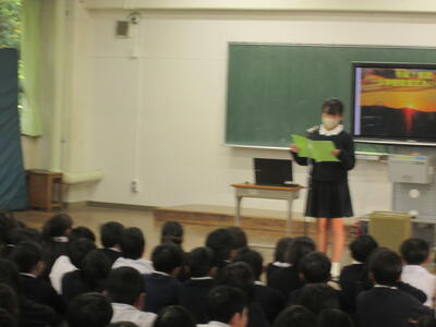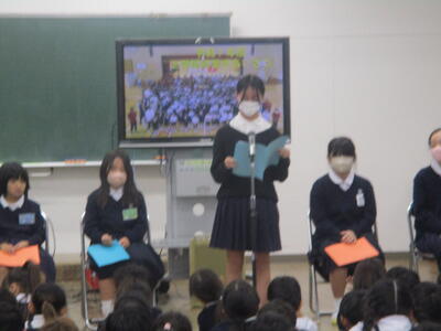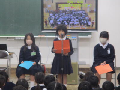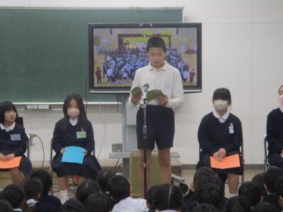 長かった2学期も最終日を迎えました。終業式では、まず、各学級の代表による2学期をふり返っての作文発表がありました。どの児童も内容・態度とも立派でした。