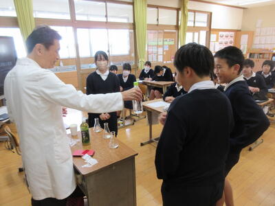 薬に見立てた粉末がどの液体でよく溶けるかなど、実際に実験を通して、正しい薬の飲み方を教えていただきました。そして、薬の飲み過ぎであるオーバードーズの危険性についても学びました。