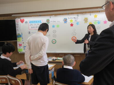 2組は、自立活動「自分の弱点を見つけ、パワーアップした自分になろう」という題材でした。ジェスチャーゲームや輪投げなどの楽しい活動を通して、自分の弱点を見つけ、その解決法を実践していく学習でした。