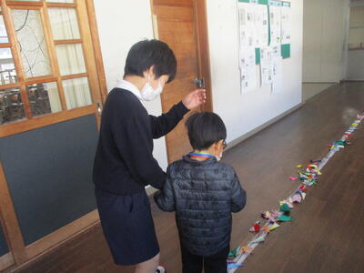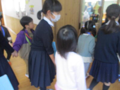 5年生が手をつないで校舎を案内します。新入生はワクワクしながら校舎探検に出かけました。