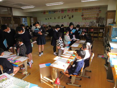 待ち時間は5年生が準備した絵本の読み聞かせをしっかりと聞いていました。1年教室では1年生が考えたお店屋さんごっこを楽しみました。5年生も1年生も新入生のために一生懸命がんばっていました。