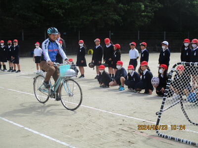 2校時が1,3,5年生、3校時が2,4,6年生で行いました。模範の走行の様子を見て、安全な自転車の乗り方を学びました。
