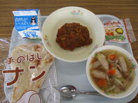 <メニュー>ナン、野菜のスープ煮、ドライカレー、豆乳プリンタルト、牛乳