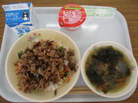 <メニュー>豚キムチ丼、わかめスープ、豆乳いちごプリン、牛乳