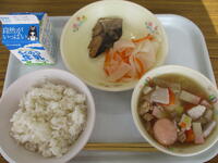 <メニュー>麦ご飯、雑煮、紅白なます、ぶりの照り焼き、牛乳
