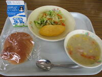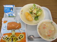 <メニュー>防災用パン、豆乳スープ煮、ミートオムレツ、白菜サラダ、牛乳