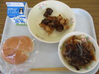 <メニュー>黒糖パン、五目うどん、千草焼き、ゆかり和え、牛乳