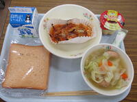 <メニュー>麦ご飯、豚キムチ、わかめスープ、ぶどうゼリー、牛乳