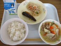 <メニュー>麦ご飯、すいとん汁、鮭の塩焼き、たくあん和え、牛乳
