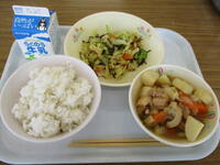 <メニュー>麦ご飯、里芋のそぼろ煮、ごま和え、牛乳
