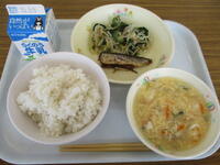 <メニュー>麦ご飯、かき玉汁、いわしの梅煮、野菜の和え物、牛乳