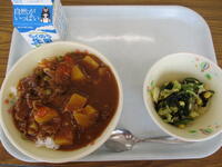 <メニュー>ビーフカレー、海藻サラダ、牛乳
