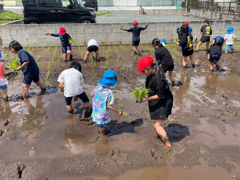 7月3日(水)に鹿本こども園の子どもたちと一緒に5年生が地域の田んぼを借りて田植えを行いました。