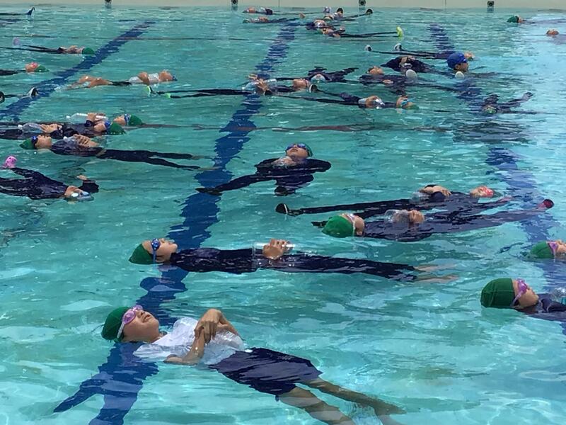 服を着たままで重くて動きにくいと言っていた子どもたちでしたが、最後はペットボトルなしでも自分で浮くことができていました。
