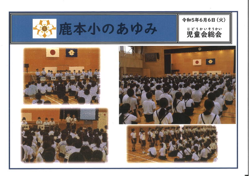 令和5年6月6日に児童会総会がありました。児童会(くすのき会)の各委員会の委員長と副委員長が前に座っています。各委員会の活動内容やお願いを発表しました。