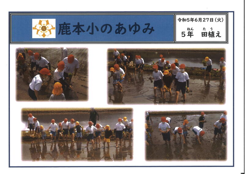 令和5年6月27日(火)に、お隣の「鹿本こども園」の年長さんたちと一緒に田植えをしました。