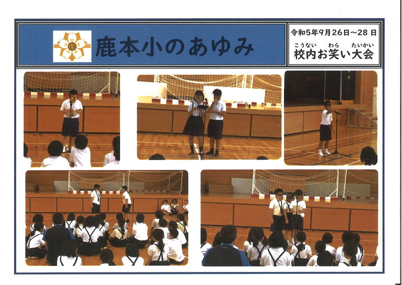 校内お笑い大会が、くすのき会(児童会)主催で行われました。大会に参加した子どもたちは、自分たちで考え、練習したネタをたくさんの人の前で披露してくれました。聞いていた子供たちや先生も、大笑い。とても楽しい時間でした。