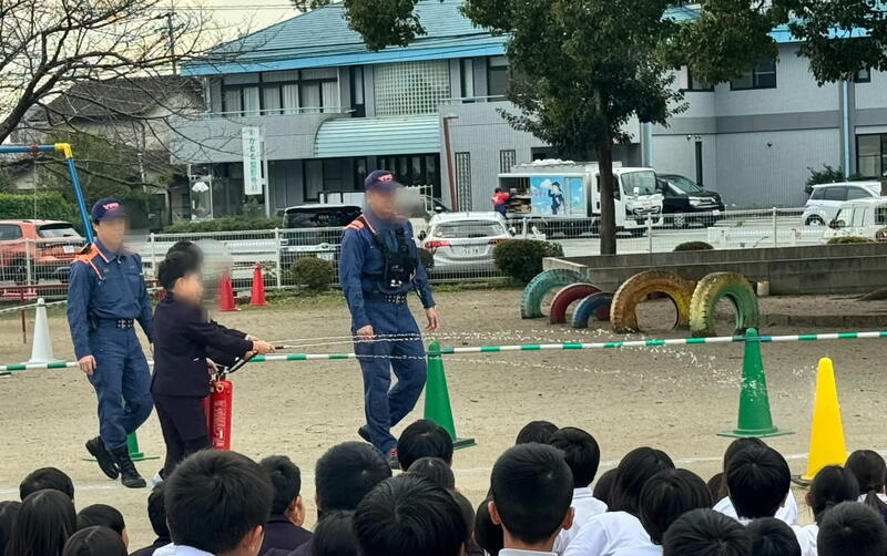 また、5、6年代表児童6名が実際に消火器を使って消火訓練も行いました。