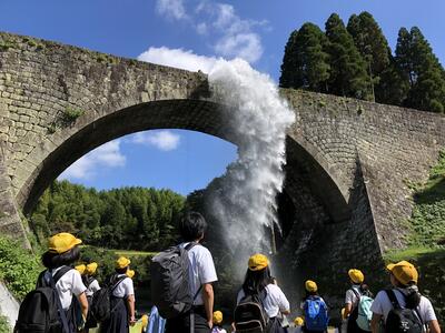 4年生の見学旅行は、山都町の円形分水と通潤橋周辺を見学しました。