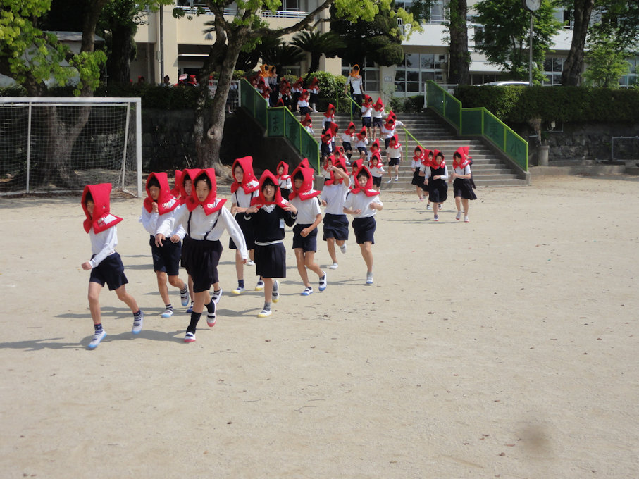 5月2日に、避難訓練を行いました。地震発生の放送を聞いて机の下に避難、防災ずきんをかぶって運動場に避難するまでを行いました。