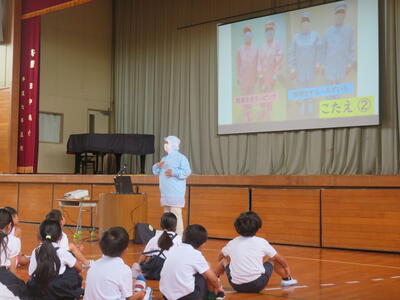 給食センターの内部の動画を見ながら、「給食ができるまで」について学びました。