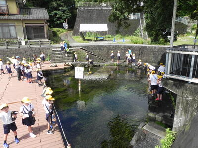 子供たちは、あちこち湧水をのぞき込みながら天然プールへ。