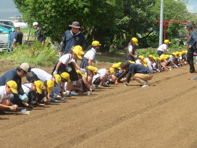 9日、嘉島町青壮年部の皆様のご協力で、3年生が大豆を植えました。