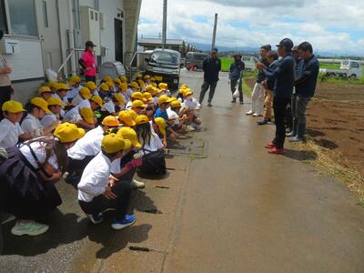 梅雨の晴れ間で気温が上がる中、地域の農家の方に教えてもらいながら、泥だらけになって頑張りました。