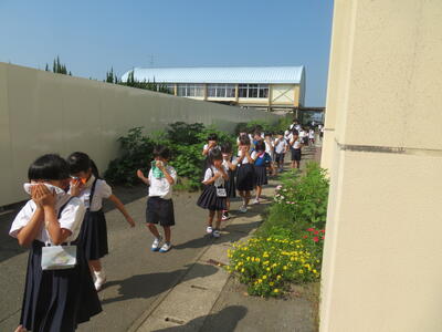 工事で通路が狭くなって避難経路を一部変更しましたので、事前指導を十分に行った上での訓練でしたが、避難の時は押したり走ったりなどの危険な様子もなく、どの学年も整然と速やかに避難ができていて感心しました。