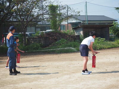 その後、上益城消防本部の方のお話を聞き、6年生代表児童が水消化器を使って消火訓練も行いました。